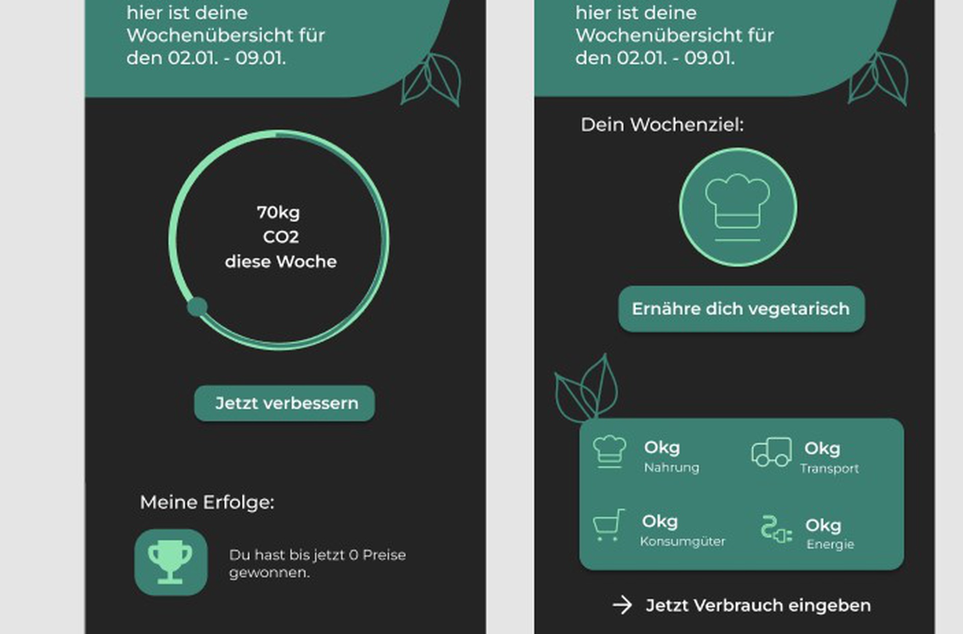 „Climate Changers“ ist eine von meinen zwei Kommilitonen und mir entwickelte App, die dazu dient, den ökologischen Fußabdruck zu reduzieren. Die Anwendung beinhaltet einen Rechner, einen Informationsbereich, wöchentliche Zielsetzungen sowie eine Sammlung von Errungenschaften und Trophäen.